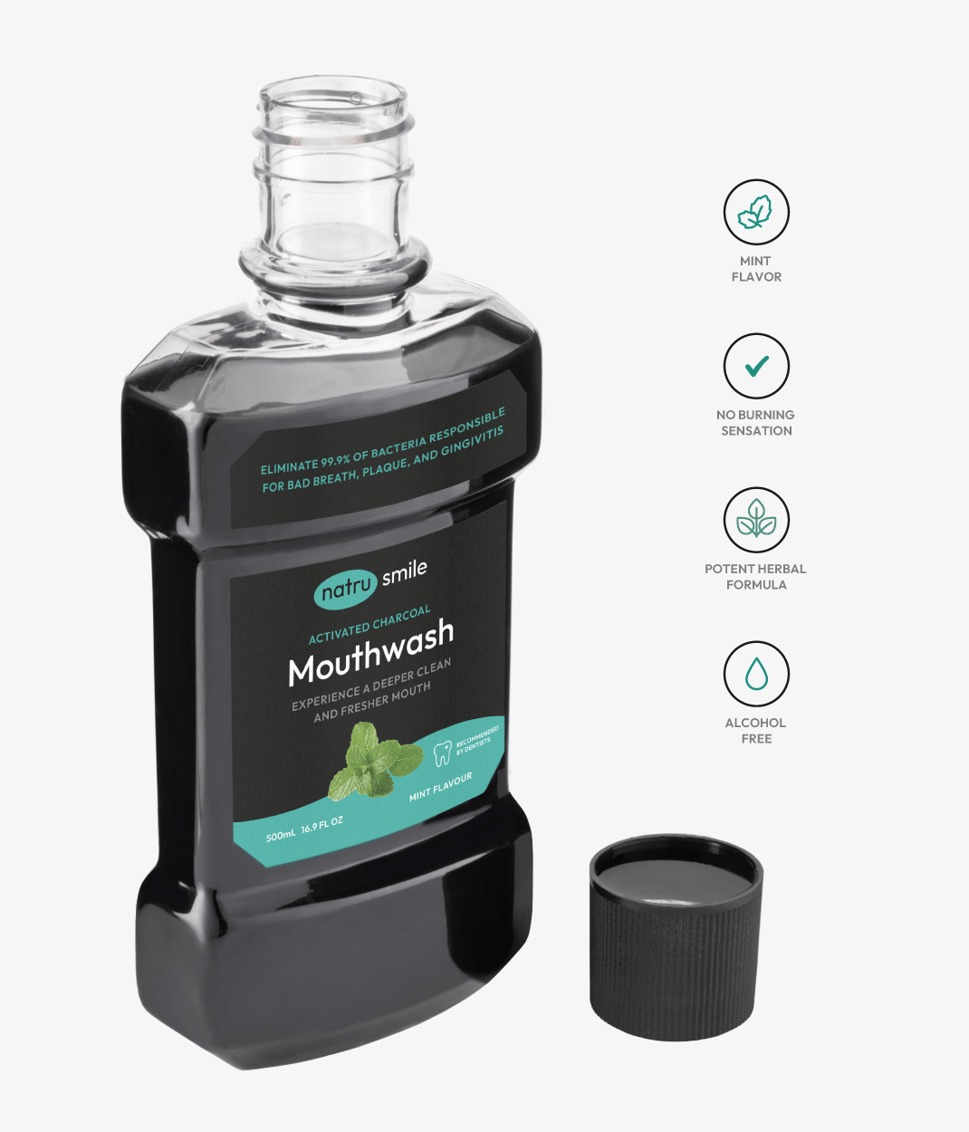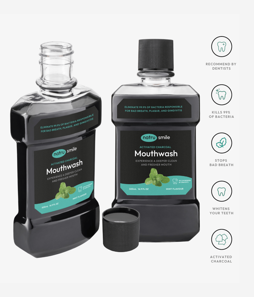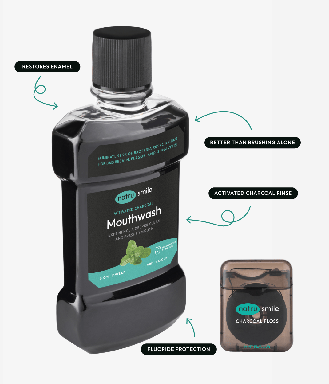 NatruSmile Teeth Whitening Mouthwash protects your mouth from cavities while refreshing your breath and keeping your teeth white. Because of its abrasive nature, activated charcoal is perfect for removing surface stains and maintaining the results of an at-home or professional whitening treatment. With the added benefit of powerful menthol and peppermint, NatruSmile mouthwash also leaves you feeling refreshed. Since it contains fluoride, you have guaranteed oral protection.