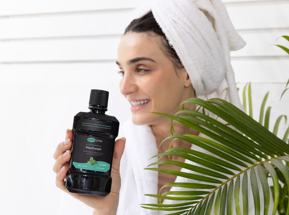 NatruSmile Teeth Whitening Mouthwash gives you the best of both worlds, combining the whitening power of activated charcoal, the remineralizing capability of xylitol, the oral protection of fluoride, and the freshening benefits of peppermint oil—all without using harsh alcohols and bleaching agents.