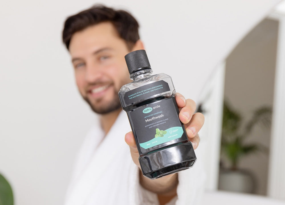 Elevate your oral hygiene routine with NatruSmile Teeth Whitening Mouthwash, the perfect way to keep your teeth clean and white.