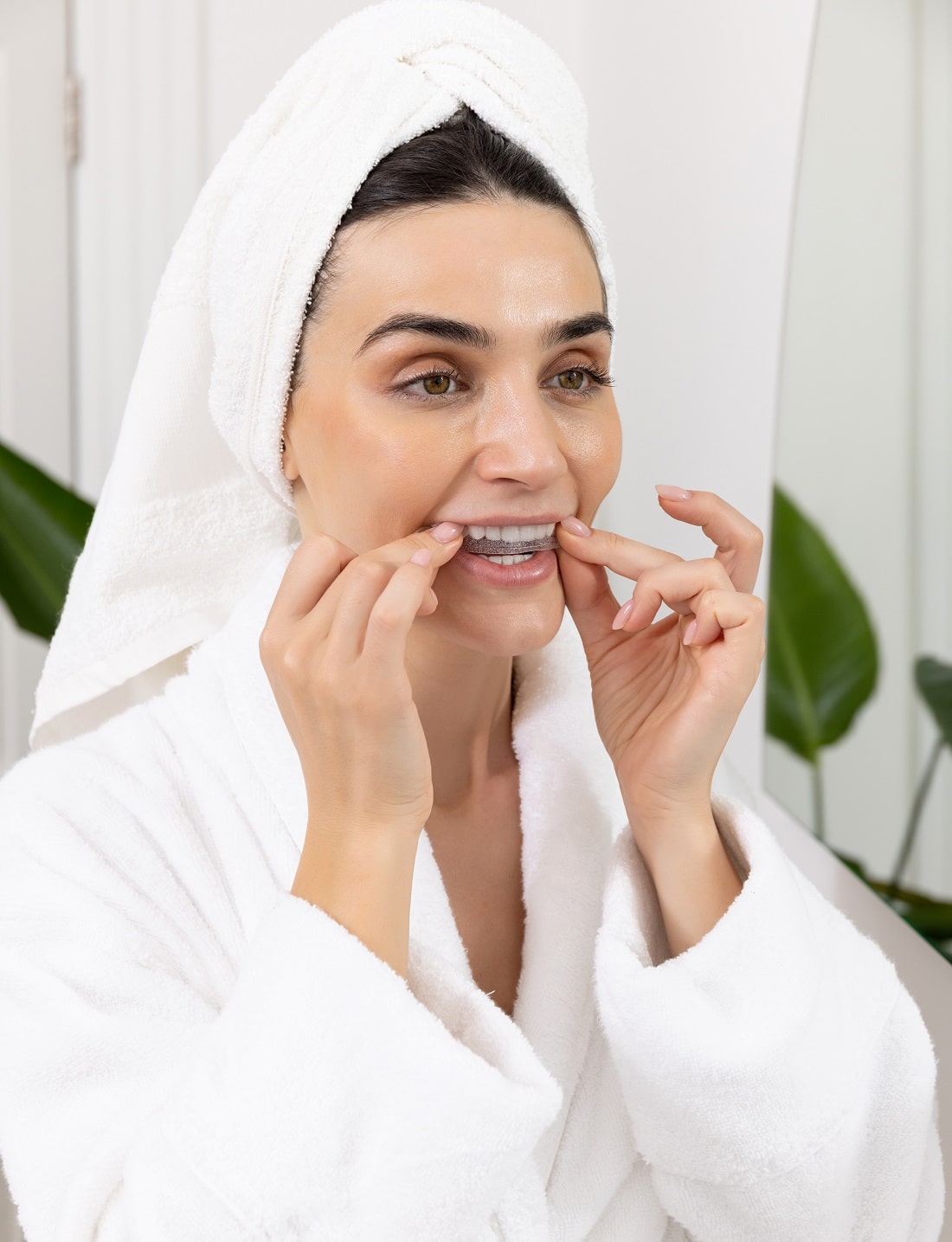 Stretch our flexible whitening strips to fit the shape of your mouth. Make sure to press them into the surface of your teeth for a secure fit.